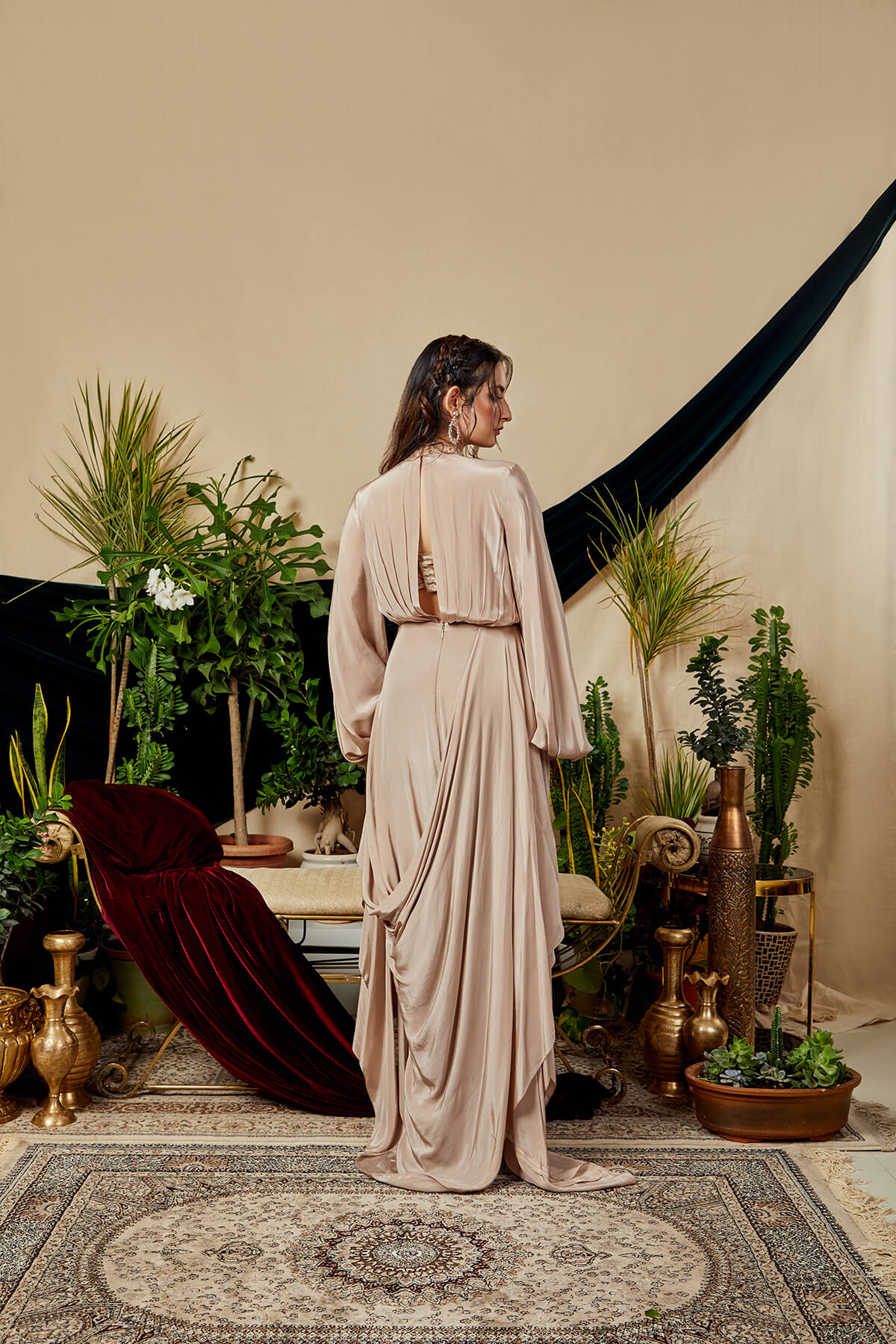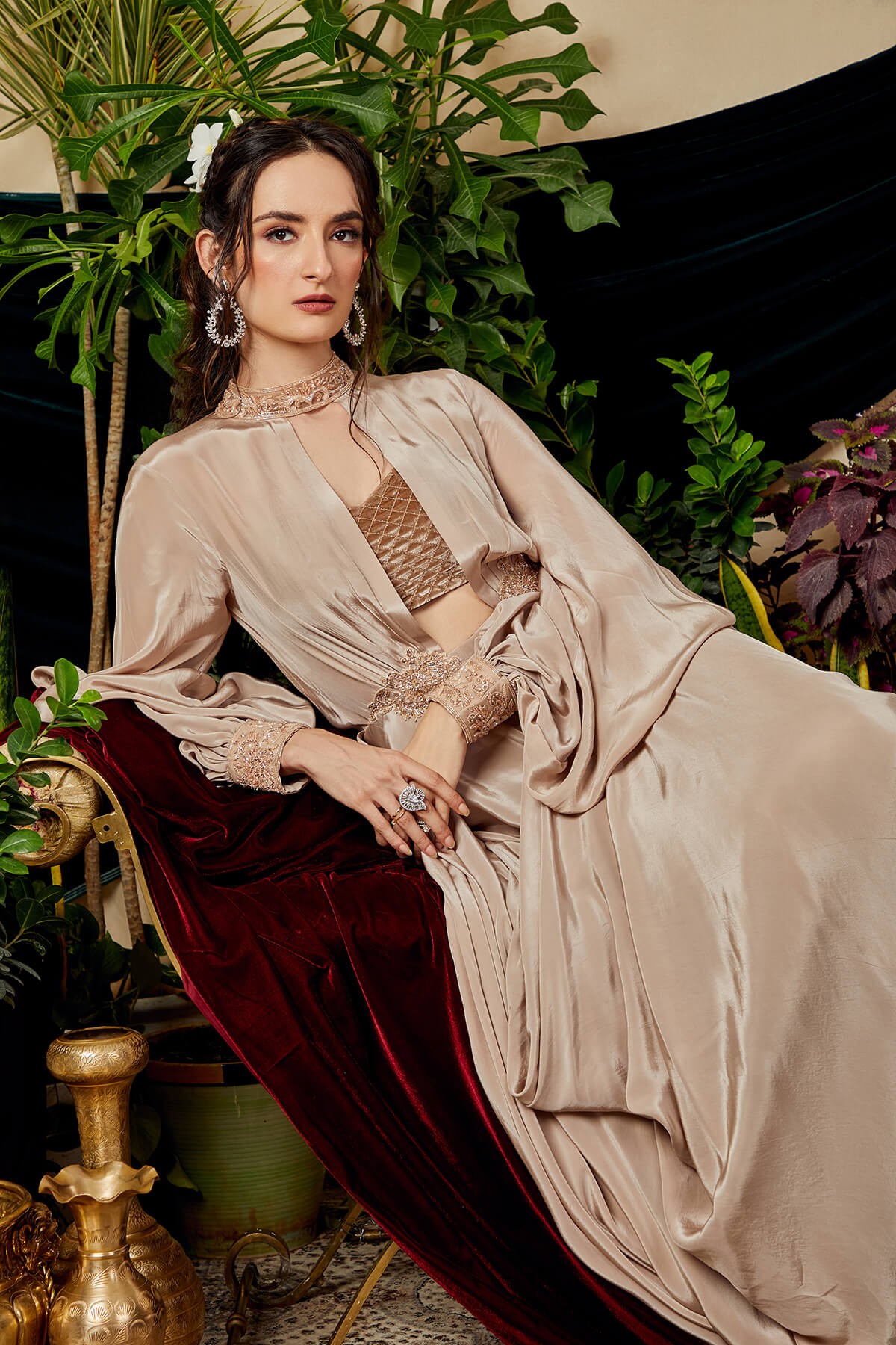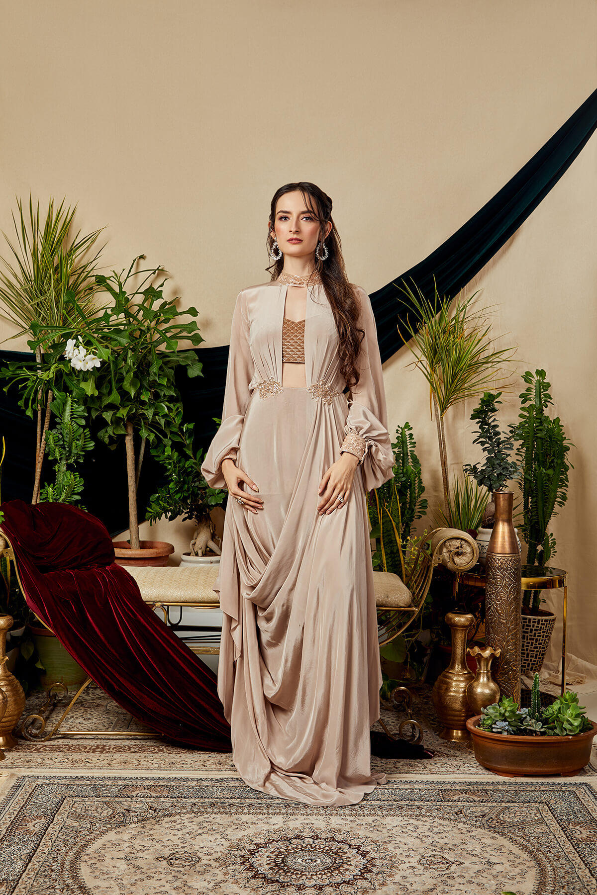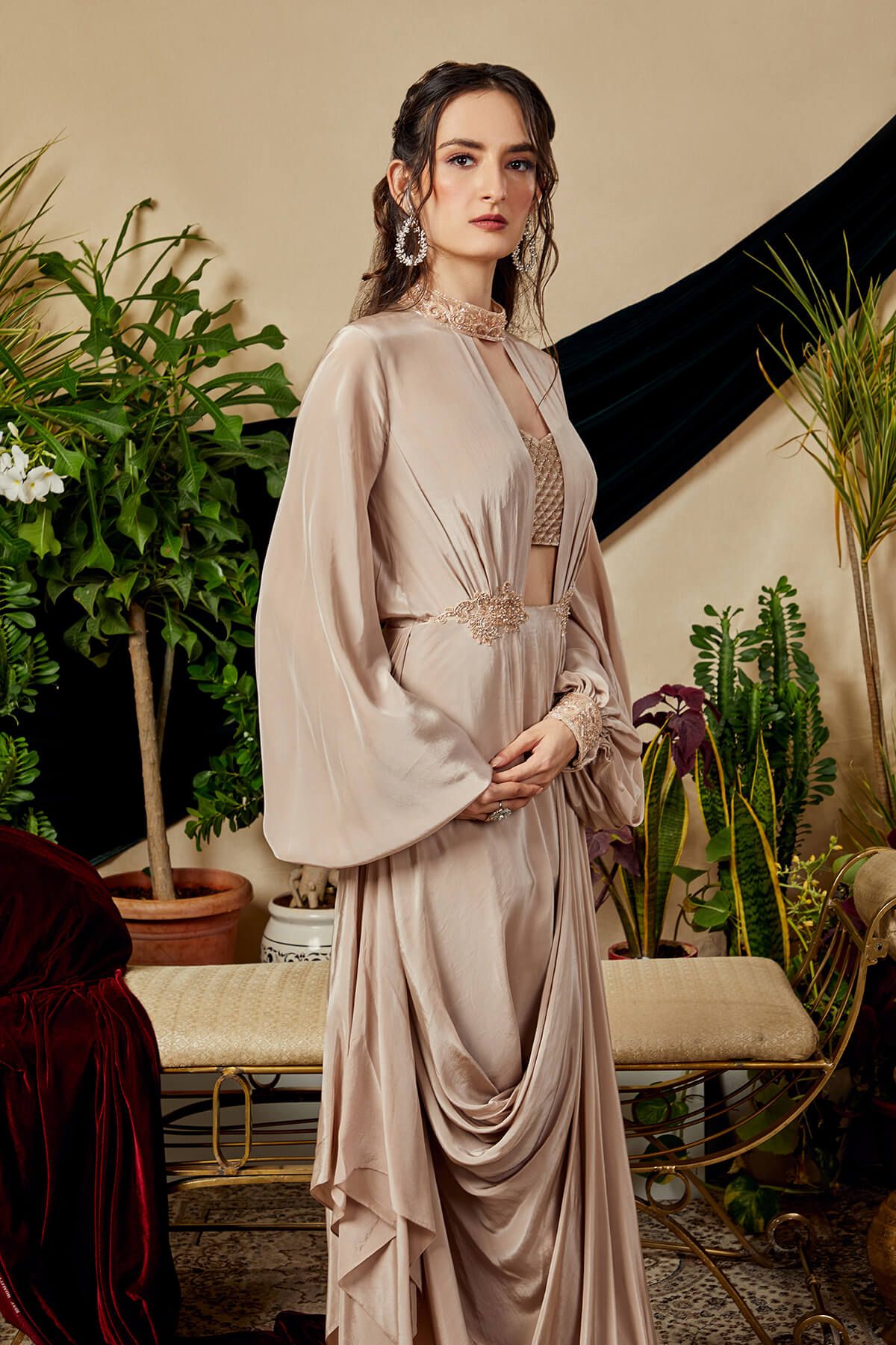 Look your fashionable self in this stylishly draped asymmetric floor length gown. Adding to the beauty of this ensemble is a quilted velvet cropped blouse. Giving a fine touch to the look is the exquisite hand embroidery.